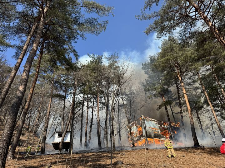[양양=뉴시스] 이순철 기자 = 12일 오전 10시12분께 강원 양양군 현북면 장리의 한 농막에서 발생한 화재가 인근 야산으로 번져 소방당국이 한때 대응2단계를 발령했다.